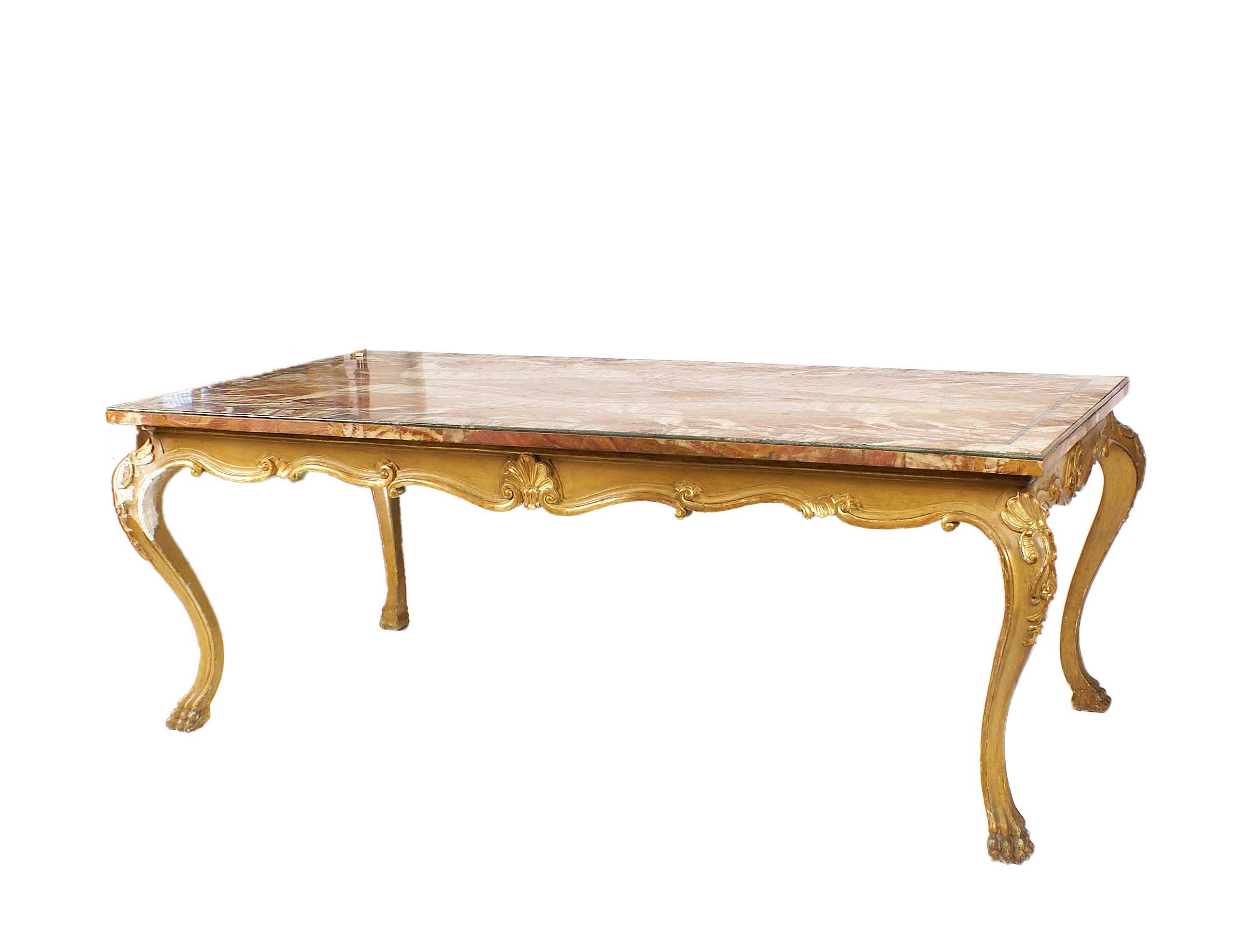 GRANDE TAVOLO IN LEGNO DORATO Italia primi anni del XX Piano rettangolare in alabastro egiziano filettato e profilato in marmo verde Guatemala, fascia sottostante riccamente intagliata e poggiante su sostegni di linea arcuata con terminali a piede ferino Dim. 80x210x104 cm.