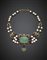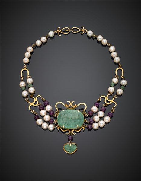 Collier in oro giallo, perle, boules di rubini e smeraldi rifinito al centro co