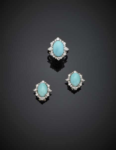 Oval cabochon turquoise and diamond white gold jewelry set comprising earclips and ring, ring size 11.50/51.50 earrings of cm 1.80, diamonds in all ct. 2.80 circa, in all g 13.47.