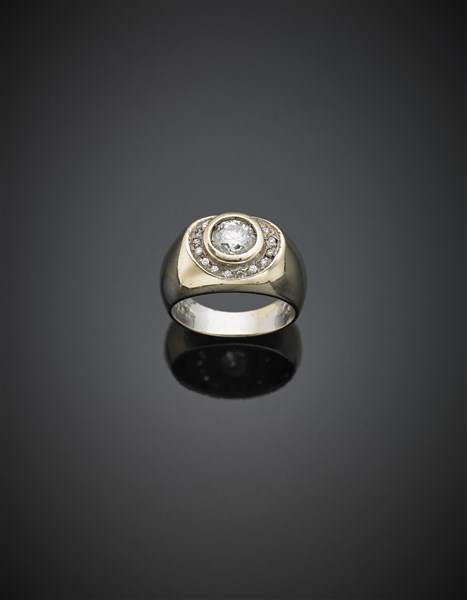 Lotto 810 | Anello in oro bianco con diamante centrale di ct. 1,20 circa contornato da altr