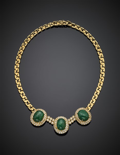 Collier a catena in oro giallo con al centro tre smeraldi cabochon per complessivi ct. 38,50 circa e diamanti per complessivi ct. 3,10 circa a rifinirli, g 91,04, lungh. cm 41,50 circa.
