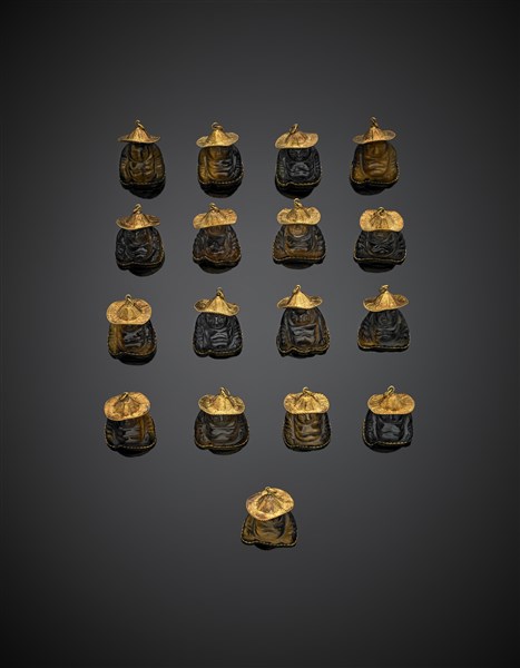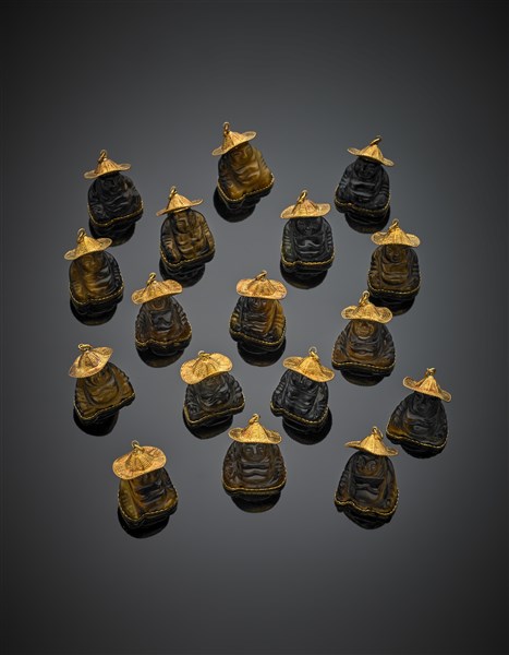 Lotto composto da diciassette pendenti in occhio di tigre scolpiti a forma di Buddha e rifiniti in oro giallo 500/1000, complessivi g 133,07.