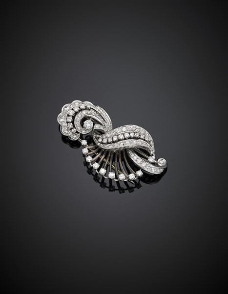 Spilla a volute in platino, oro bianco e diamanti rotondi per complessivi ct. 2,80 circa, g 17,34, lungh. cm 5,10 circa. Marchi Francesi e austriaci.