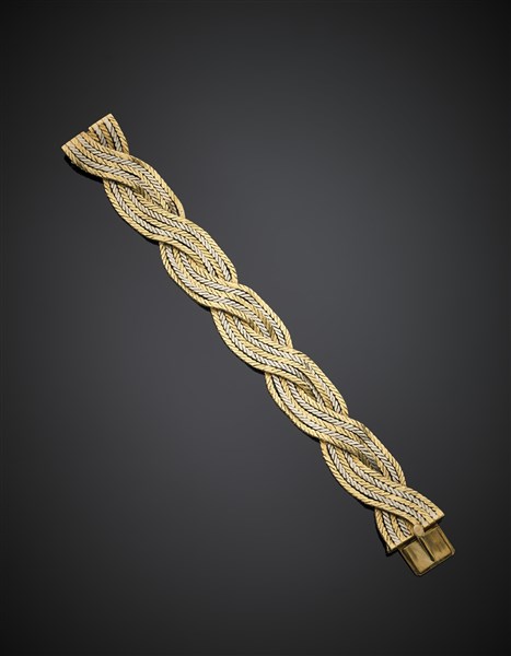 Bracciale intrecciato in oro giallo e bianco, g 74,85, lungh. cm 19 circa. Marcato 359 MI.