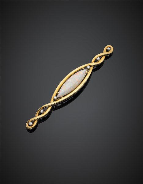 Spilla intrecciata in oro giallo rifinita con opale a navette di mm 32 x 8 circa e diamanti, g 18,39, lungh. cm 9 circa.