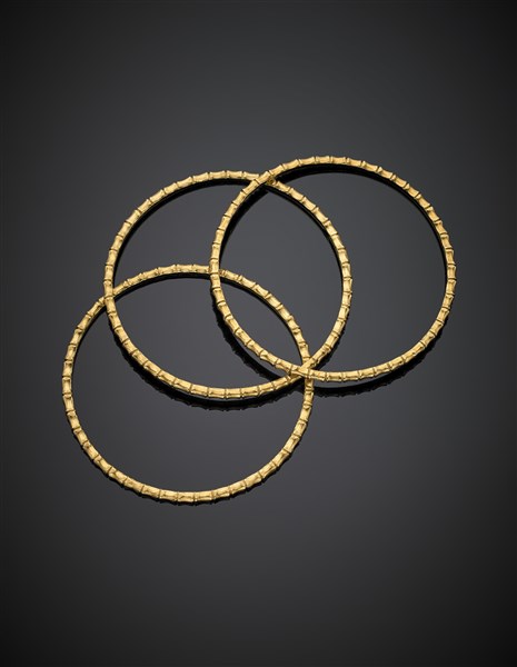 Tre bracciali in oro "a canna di bamboo", complessivi g 44,46, diam. cm 6.