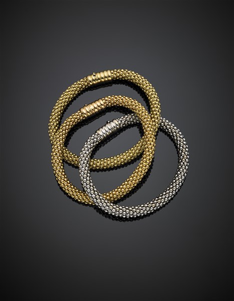 MASELLA Lotto di tre bracciali, uno in oro bianco, uno in oro giallo e uno in o