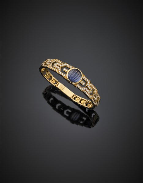 Round ct. 9 circa carved sapphire and diamond yellow gold modular bracelet, diamonds in all ct. 2.30 circa, g 38.52, diam. cm 5.50. Marked 26 AL. In Fasano case