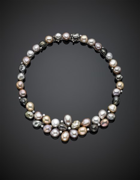 Collier in oro bianco, diamanti rotondi e perle d'acqua dolce di vari colori e forme, con piccola prolunga, complessivi g 110,38, lungh. cm 39 circa. Firmata Schoeffel.