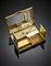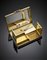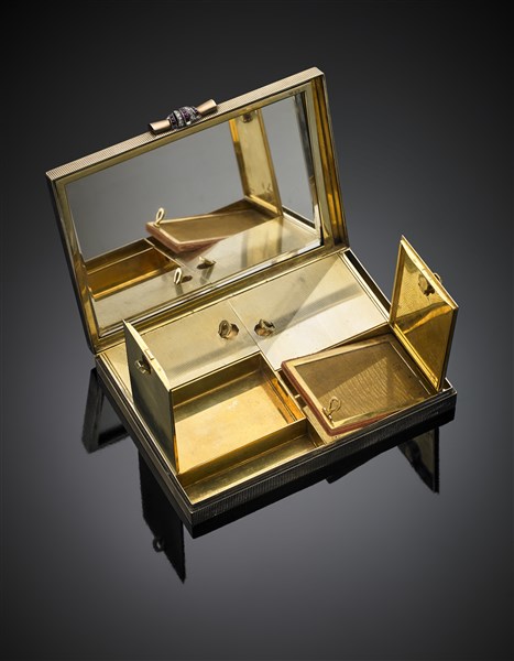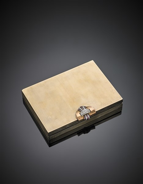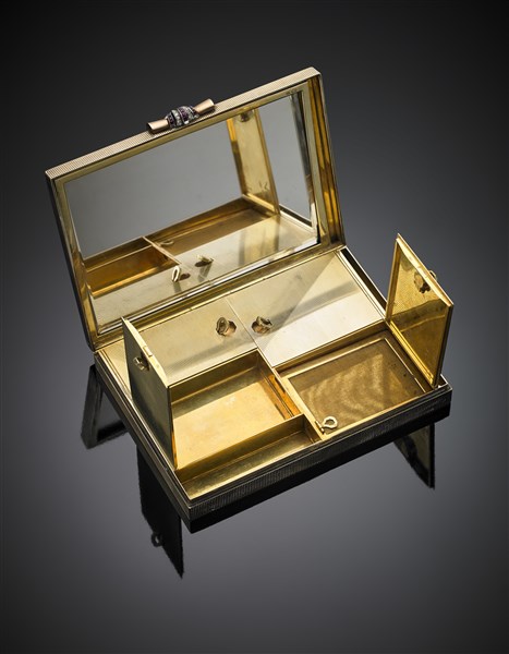 Silver gilt grooved minaudière with bi-coloured gold ruby and diamond buckle clasp, inside mirror and compartments, gross g 722.75, length cm 14.50, width cm 10.50, h cm 2 circa. Marked CIF. (defects and losses)