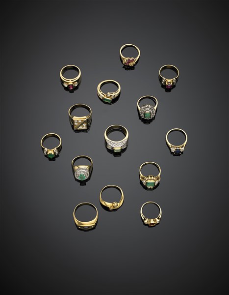 Lotto composto da quattordici anelli in oro giallo e bianco, diamanti, smeraldi, rubini, zaffiri e paste vitree, complessivi g 93,6.
