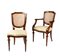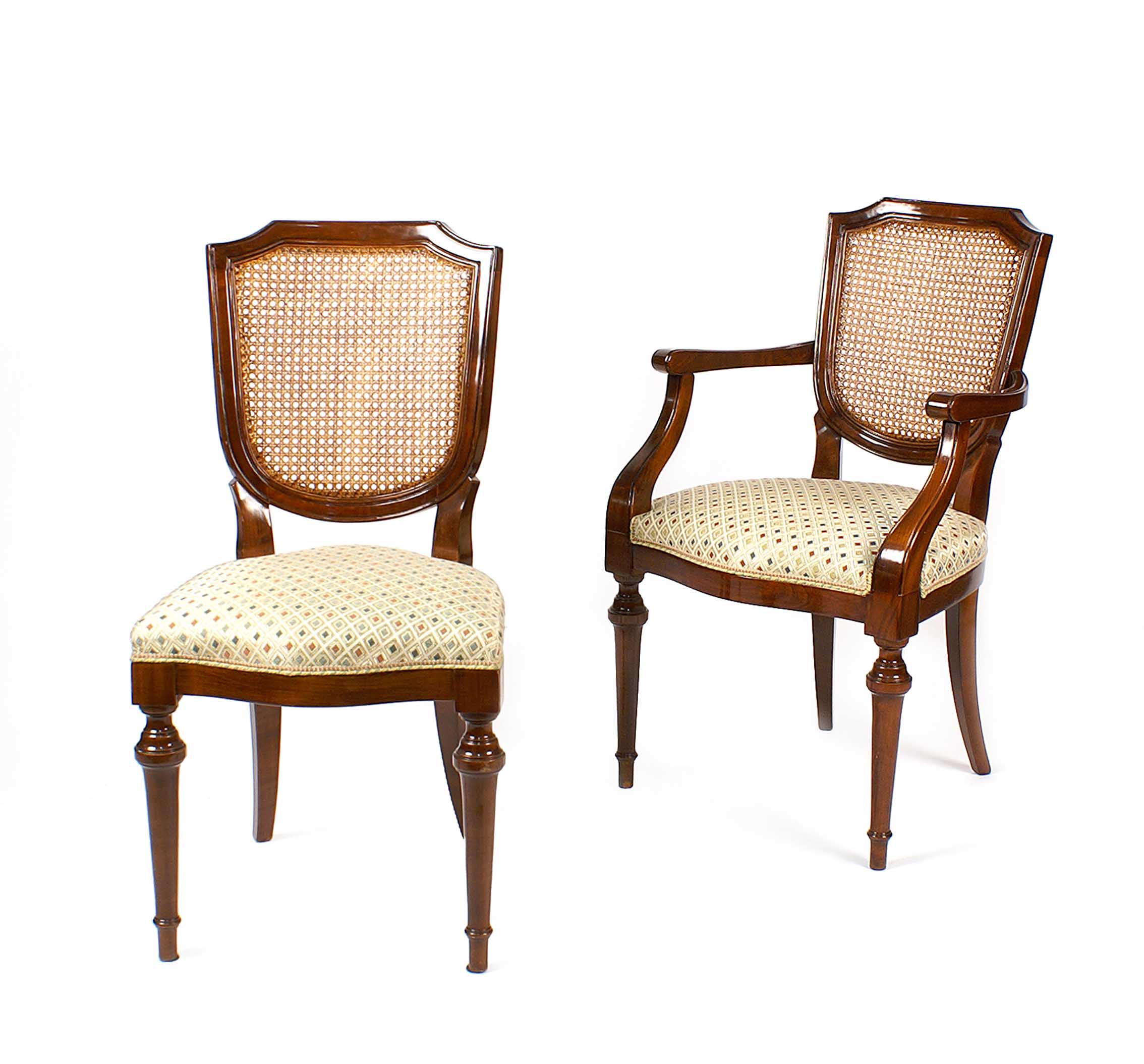 DODICI SEDIE E DUE POLTRONCINE In ciliegio tinto noce con schienali in paglia di Vienna e sedute imbottite e rivestite in tessuto