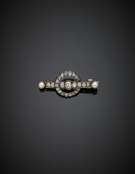 Spilla in oro giallo e argento rifinita con diamanti old mine di varia forma e colore, da incolori a fancy per complessivi ct. 1,00 circa e perle, g 4,07, lungh. cm 3,50 circa. Marchi austriaci.