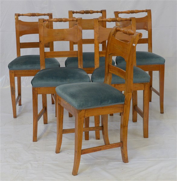 Gruppo di sei sedie in noce con schienale a cartella, gambe mosse. Secolo XIX (