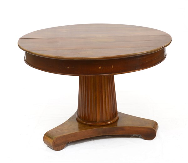 Tavolo con piano tondo, gamba centrale tornita e scanalata, poggiante su base triangolare (d cm 116 x h cm 79) (difetti e restauri)