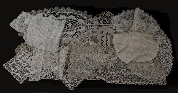 Lotto di undici pizzi di cotone di varie fogge e dimensioni con lavorazioni ad ago, all'uncinetto e al tombolo. Secolo XX