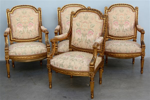 Fornitura da salotto composta da un divano e quattro poltrone in legno intagliato e dorato a foglie, fregi e piccoli rosoni. Rivestito in tessuto operato (lievi difetti)