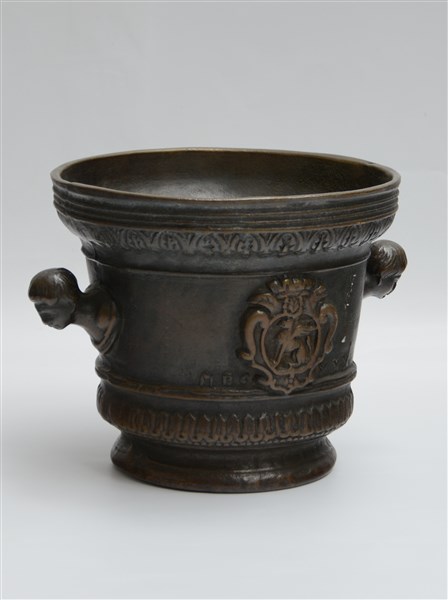 Mortaio in bronzo con anse a forma di teste maschili e fascia centrata da stemm