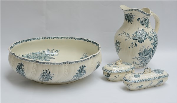 Manifattura francese Saint Amand, set da toilette in ceramica decorata a motivi floreali composto da una brocca con catino e due contenitori con coperchio (difetti)