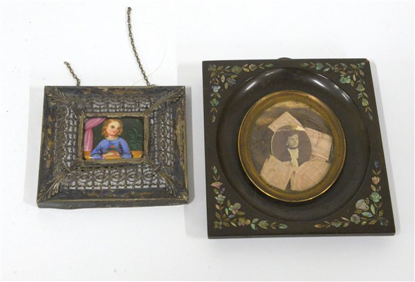 Lotto composto da una cornicetta in legno e madreperla, Francia secolo XIX, unita a un'altra in argento (difetti)