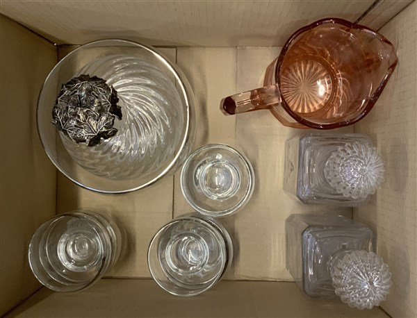 Lotto 159 | Cartone contenente un servizio per macedonia in vetro e alcune bottiglie (difet