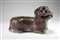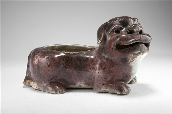 Incensiere in grés porcellanato a forma di leoe buddhista con invetriatura color melanzana (difetti e mancanze)