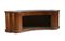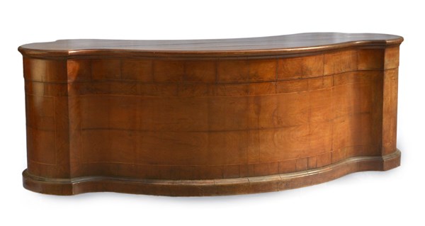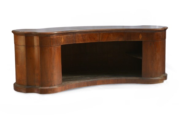 Bancone con fonte sagomato lastronato in noce e radica di noce e filettatato. Quattro cassetti sottopiano nella parte superiore (cm 236x82x100)(difetti e mancanze)