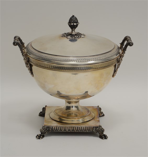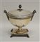 Coppa biansata in argento poggiante su base quadrata sorretta da piedi ferini. Coperchio cimato da presa a guisa di pigna stilizzata. Anse a volute fogliate e bordure decorate a palmette. Titolo 800 (g 1149 ca.) (h cm 22) (difetti)