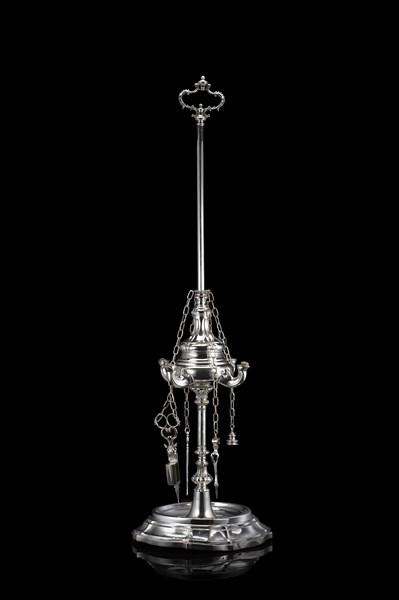 Lotto 213 | Lampada fiorentina in metallo argentato con fusto a corpo liscio e contenitore