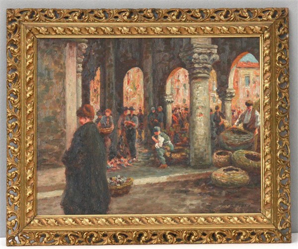 "Mercato" olio su compensato (cm 40x50) Firmato in basso a destra. In cornice