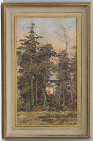 "In Brianza" Aprile '960, olio su compensato (cm 70x40) Firmato in basso a sinistra. Al retro: titolato e datato. In cornice