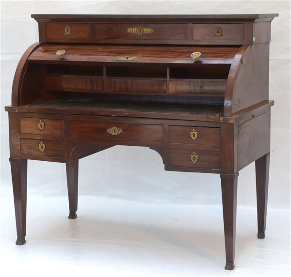 Ribalta a rullo con fronte a otto cassetti di cui tre in linea sottopiano ed anta scorrevole celante vani, cassettini e piano in pelle, gambe rastremate scolpite a piedi ferini, piano in marmo. Secolo XIX (cm 133x126x68) (difetti)