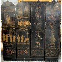 Paravento a quattro ante in legno laccato con dorature, decorato con figure (h.