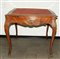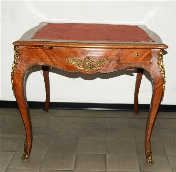 Tavolo da gioco di forma mossa a quattro cassetti con fasce, gambe e piedi decorati con applicazioni in metallo dorato (difetti e mancanze)