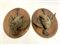 Coppia di sculture in bronzo raffiguranti cacciagione montate su pannello ovale