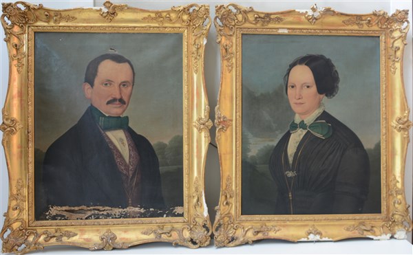 Scuola del sec. XIX "Gentiluomo e gentildonna" coppia di olii su tela in cornici coeve in legno e pastiglia dorata (cm 84x69) (gravi difetti e mancanze)