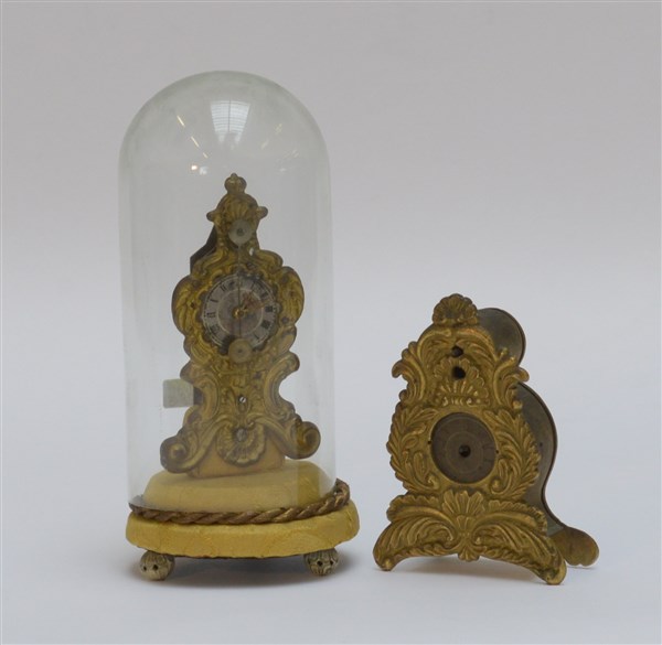 ANONIMO. Lotto di due orologi austriaci Zappler in lamina dorata, uno sotto campana di vetro. Epoca seconda metà secolo XIX. Misure diverse. (difetti e mancanze)