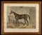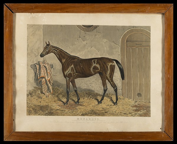 Litografia francese a colori del secolo XIX raffigurante il purosangue "Monarque" (cm 58x74) in cornice (difetti)