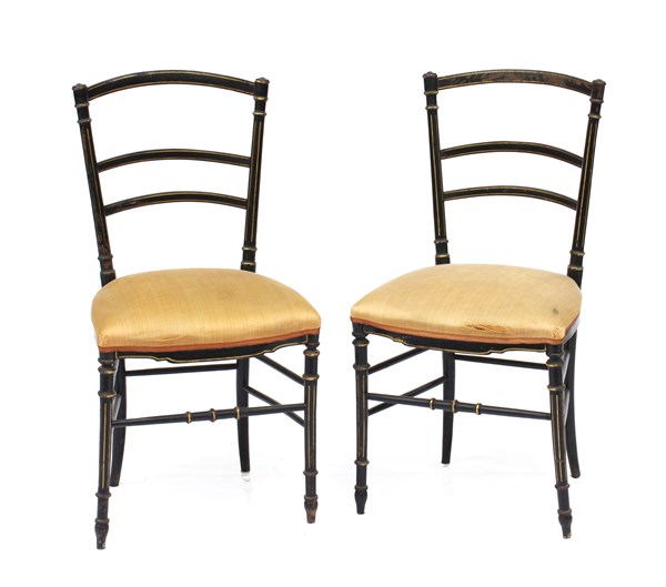 Coppia di sedie in legno ebanizzato, schienale a giorno decorate con filettature dorate (difetti)