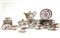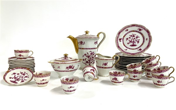 Manifattura francese. Servizio da caffè in porcellana dipinto a motivi naturalistici rosa con filettature dorate composto da: 12 tazzine con piattini, 12 piatti per dolce, caffettier, lattiera e zuccheriera (lievi difetti)
