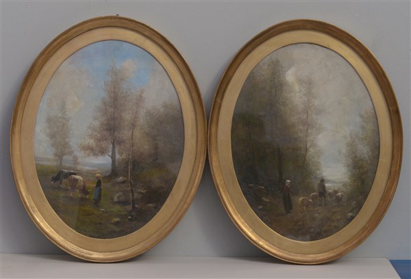Firma indecifrata, coppia di dipinti ovali raffiguranti "Scene agresti" olio su