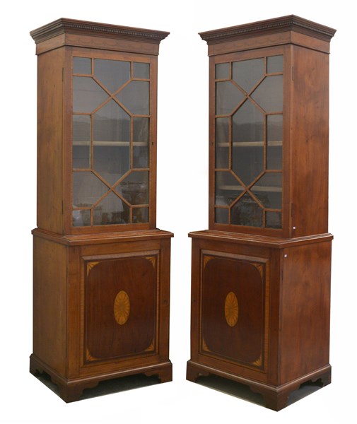 Coppia di librerie a due corpi con parte inferiore a uno sportello e parte superiore a vetrina, decorate con filettature e piccoli intarsi. Inghilterra, secolo XX (cm 71x212x52) (difetti)