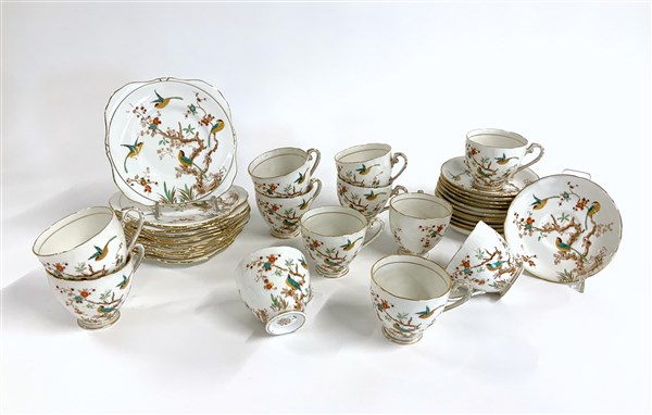 Manifattura inglese. Servizio da te in porcellana dipinto in policromia a motiv