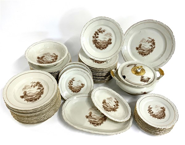 Manifattura tedesca. Servizio di piatti in porcellana con decoro a paesaggi composto da 12 piatti fondi, 24 piani, 12 piattini per frutta, due piatti da portata ovali e uno tondo, una zuppiera e insalatiera (difetti)