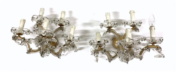 Coppia di appliques a cinque luci con pendagli in cristallo sfaccettato (largh.