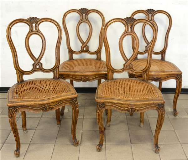 Lotto 330 | Gruppo di quattro sedie in noce di forma mossa con schienale a giorno e seduta