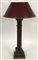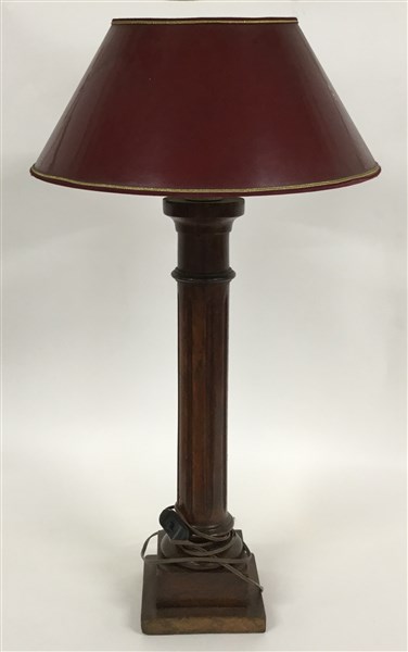 Lampada da tavolo ad una luce con fusto in legno a colonna scanalata e paralume color bordeaux (h tot cm 78) (difetti)
