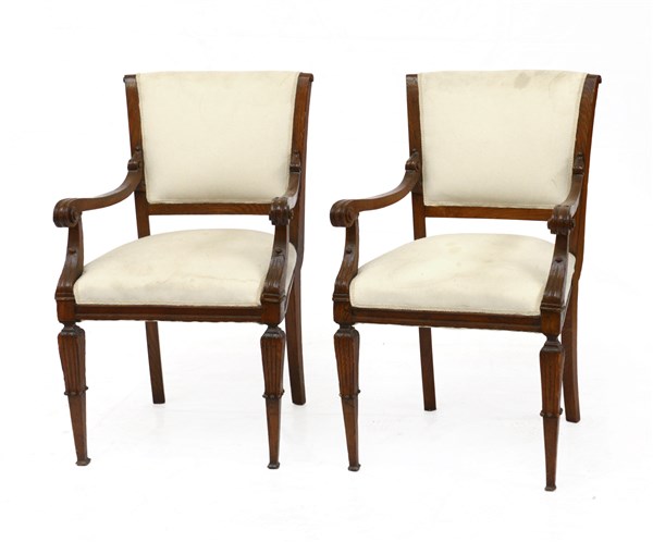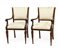 Coppia di poltrone con struttura in legno intagliato, sedute e schienale rivestite in tessuto bianco (difetti)