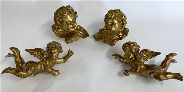 Lotto composto da una coppia di cherubini e una coppia di angioletti in legno intagliato dorato (difetti)