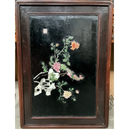 Placca decorata con inserti in porcellana e laccata in nero, in cornice in legno. Cina, secolo XX (cm 66x42,5) (difetti e restauri)